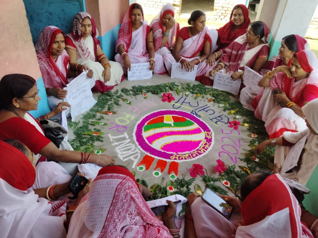 बिहार विधानसभा आम निर्वाचन 2025 में शत-प्रतिशत मतदाताओं को मतदान केन्द्र तक पहुंचाने को लेकर प्रखंड के आंगनवाड़ी केन्द्र संख्या 55 एवं 60 पर प्रखंड क्षेत्र की आंगनवाड़ी सेविकाओं द्वारा बुधवार को जागरुकता अभियान चलाया गया। इस दौरान आंगनवाड़ी सेविकाओं ने रंगोली बनाकर व रैली निकालकर मतदाताओं को जागरुक किया। सेविकाओं द्वारा मतदाताओं को अपने वोट के अधिकार एवं उसके समुचित उपयोग के लिए प्रेरित किया गया। सेविकाओं ने मतदान को लोकतंत्र का सबसे बड़ा पर्व बताते हुए इसमें सभी मतदाताओं से अपनी भागीदारी निभाने कर अपील की गई। इस मैके पर सीडीपीओ प्रीती कुमारी, एलएस रुपा कुमारी, प्रखंड समन्वयक शिशु सिन्हा, सेविका उषा कुमारी, अर्चना कुमारी, मुन्नी कुमारी, बबीता कुमारी, आरती कुमारी, पूनम बंदना, मुनिमा खातुन आदि उपस्थित थे।