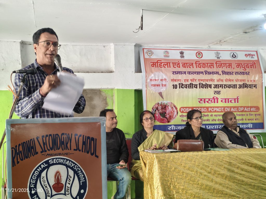 महिलाओं एवं बच्चियों की सुरक्षा, उनके अधिकारों एवं संरक्षण से जुड़ी विभिन्न कानूनी प्रावधानों, सरकारी योजनाओं तथा हेल्पलाइन सेवाओं की जानकारी आम जन तक पहुँचाने के उद्देश्य से आज बाल विकास निगम, बिहार द्वारा रीजनल सेकेंडरी स्कूल में एक दिवसीय जागरूकता कार्यक्रम का आयोजन किया गया।कार्यक्रम के दौरान विशेषज्ञों एवं अतिथियों द्वारा पॉक्सो एक्ट (बच्चों को लैंगिक अपराधों से संरक्षण अधिनियम), दहेज प्रतिषेध अधिनियम, घरेलू हिंसा अधिनियम, बेटी बचाओ–बेटी पढ़ाओ योजना सहित महिलाओं एवं बच्चियों से जुड़ी सुरक्षा नीतियों पर विस्तारपूर्वक चर्चा की गई। साथ ही चाइल्ड हेल्पलाइन – 1098 तथा महिला हेल्पलाइन – 181 जैसी महत्त्वपूर्ण सेवाओं की उपयोगिता एवं कार्यप्रणाली के बारे में भी विद्यार्थियों को विस्तृत जानकारी दी गई।विशेषज्ञों ने बच्चों को विभिन्न कानूनी उपायों, उपलब्ध सहायता सेवाओं तथा शिकायत दर्ज कराने की प्रक्रिया के बारे में भी जागरूक किया, ताकि आवश्यकता पड़ने पर वे स्वयं को सुरक्षित रखते हुए उचित कदम उठा सकें।कार्यक्रम के दूसरे सत्र में प्रश्नोत्तरी एवं संवाद कार्यक्रम आयोजित किया गया, जिसमें छात्रों ने उत्साहपूर्वक भाग लिया। इस दौरान जिला मिशन समन्वयक अंजनी कुमार झा, अधिवक्ता रेणु कुमारी तथा लैंगिक विशेषज्ञ शिवराम मेहरा ने बच्चों के प्रश्नों का बड़े ही रोचक, सरल और प्रभावी तरीके से उत्तर देकर उन्हें संतुष्ट किया।कार्यक्रम को सफल बनाने में राम श्रृंगार पांडे, निदेशक, रीजनल सेकेंडरी स्कूल, मनोज कुमार, प्रिंसिपल, अजय कुमार, डाटा एंट्री ऑपरेटर, पारस कुमार, लेखा सहायक आदि की महत्वपूर्ण भूमिका रही। कार्यक्रम में भारी संख्या में छात्र-छात्राएँ एवं युवा उपस्थित थे।